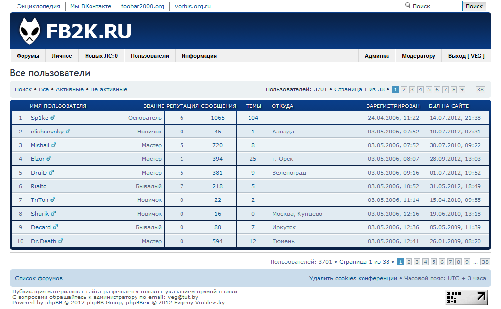 - Сортировка по колонкам «Звание», «Сообщения», «Темы», «Зарегистрирован» и «Последнее посещение» по умолчанию в обратном порядке