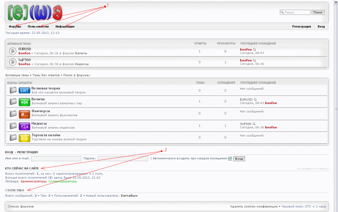 А как скрыть от гостей верхнее меню (1), и "статистика","кто сейчас на сайте"(2)?