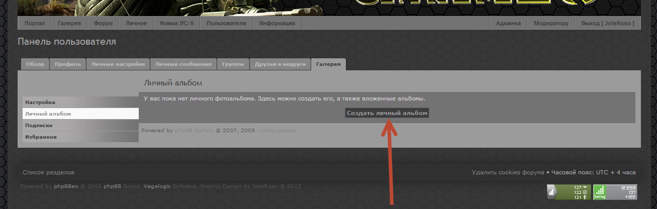 Невозможно добавить личные альбомы. Через админку можно сделать личный альбом, но фото загрузить не получается, т.к. пользователь не может зайти в альбом. В панеле пользователя вкладки "Личный альбом" вообще нет, хотя в админке включена.