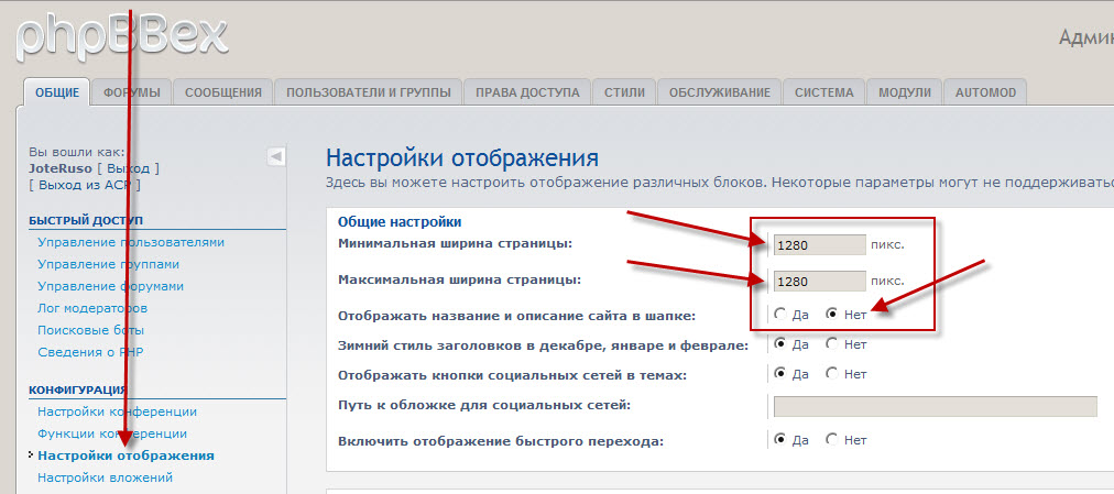 1) Идём в Админку и задаём все необходимые значения: фиксируем ширину форума и отключаем отображение названия и описания сайта (чтобы они не накладывались на наш рисунок).
