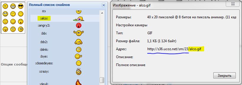 1. Добавлен импорт смайликов. В конверторе описаны и импортируются смайлики из набора №23 (Колобки - тёмный фон). У кого другой набор смайликов описываем их в массиве $smilies, главное - это указать имя файла, т.к. поиск смайликов в сообщении ведется по имени файла. Для этого раскрываем полный список смайлов в uCoz и вытаскиваем имя файла у смайликов через правую кнопку мыши. А также, меняем константу пути к смайликам UCOZ_BASE_SMILIES_PATH. Путь к смайликам и имя файла смайлика можно увидеть посмотрев свойство картинки смайлика в браузере, как на примере: