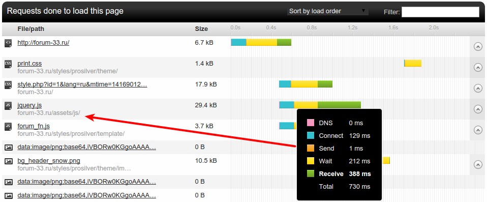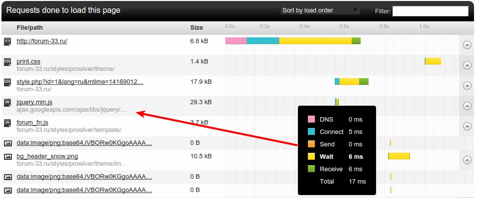 ПОСЛЕ включения этой опции скорость загрузки самой библиотеки jQuery составила всего лишь 17 мс, а общая скорость загрузки сайта стала 1,09 сек.