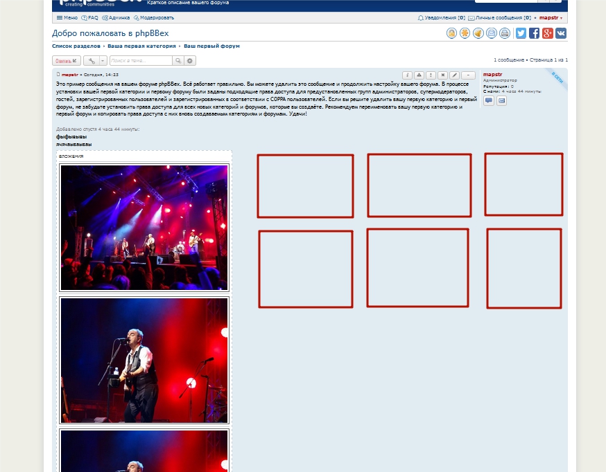 Первое сообщение, попал на ваш форум и понял что мне интересен phpbbex, т.к. много можно делать, ковырять и т.д. Ну это ладно, вопрос по загрузке изображений, поставил первый форум на phpbbex, загружаю фотографии в топик и они не красиво расположены.