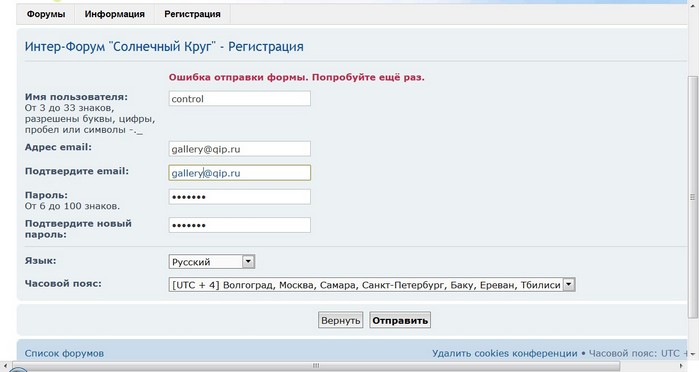 Сегодня не могу создать нового пользователя. Хотя два дня назад работало. При введении всех данных ответ: Ошибка отправки формы. Попробуйте ещё раз. Я уже и защиту от спам-ботов отключил и немедленный доступ предоставил. Результат один.Ломаю всё зановоVEG:регистрация всё равно не проходит