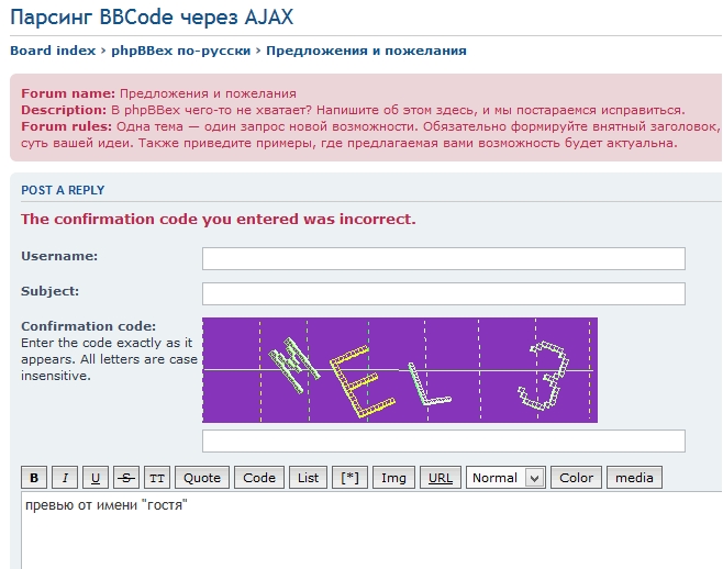 factotum:ах вы про это... превью не показывает и в дефолтном phpBBex - подавай имя, капчу и чего там еще.