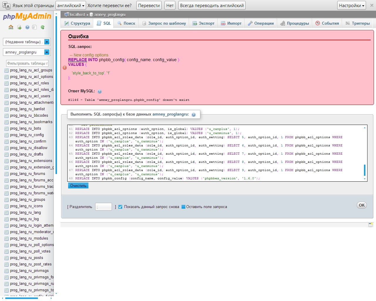 Amney, у вас нестандартный префикс. Замените в SQL файле подстроку «phpbb_» (именно со знаком подчёркивания!) на «prog_lang_ru_».