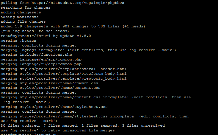 - Замените все файлы (кроме config.php!) предыдущей версии phpBBex (или используйте Mercurial для автоматического сохранения ваших модов).
