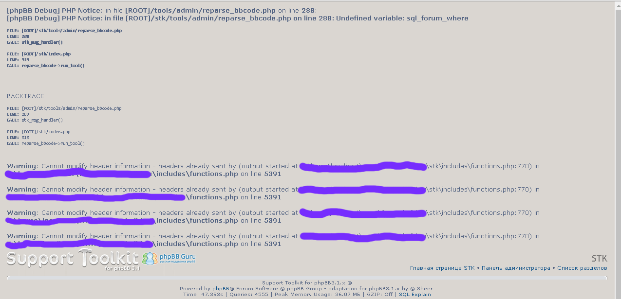 Фикс- открыть файл \stk\tools\admin\reparse_bbcode.php, найти там