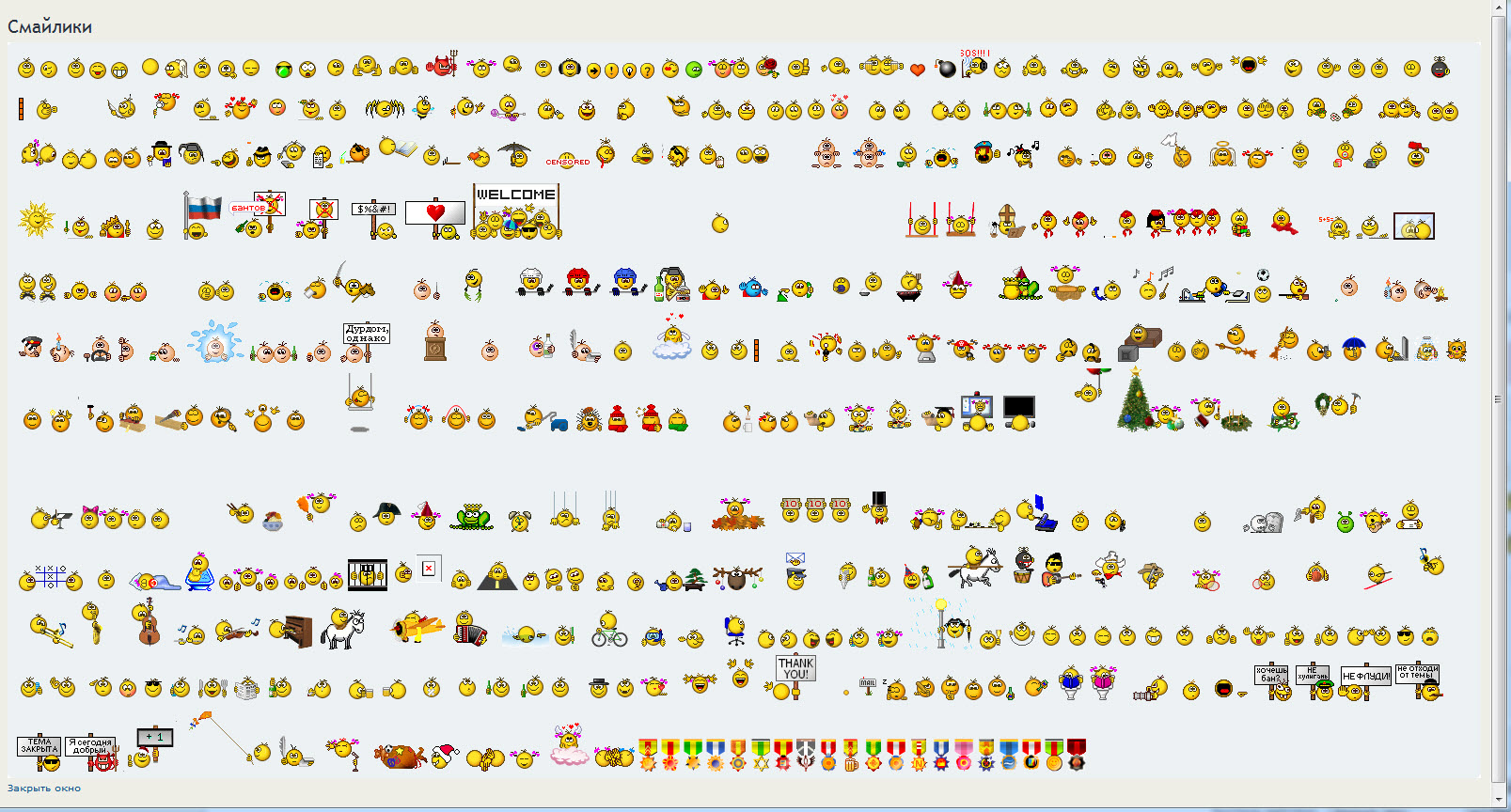 В комплекте с phpBBex идут смайлики в стиле классического набора из phpBB 2. У меня за 7 лет собралась огромная коллекция. Не знаю почему, но смайлики в таком стиле мне нравятся больше всего. Маленький размер, практически не раздвигают текст и выглядят достаточно просто. Популярные в рунете «колобки» уже успели поднадоесть на мой взгляд. Однако, это всё моё ИМХО. А что думаете вы по этому поводу? Просто интересно мнение пользователей phpBBex.