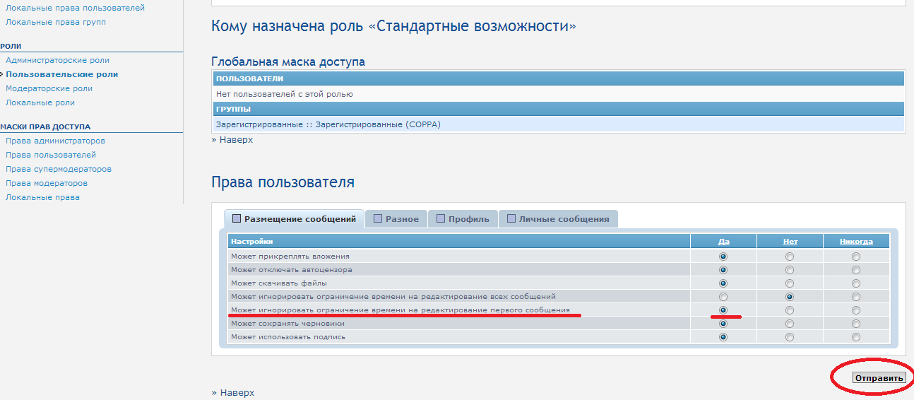 На этом форуме я могу отредактировать свой первый пост в созданной теме без ограничения по времени, а у себя на форуме пользователи не могут такое проделать, быстрым поиском не нашел, в админке ничего подходящего не вижу. Собственно вопрос, не знаю где это включить, чтоб пользователь смог сам редактировать первый пост в своей теме, и только первый пост, остальные сообщения в теме пользователь может отредактировать в течении 1 часа. Заранее спасибо.