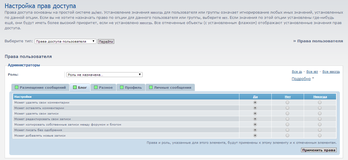 Но в настройке прав, остались права доступа, от блога: