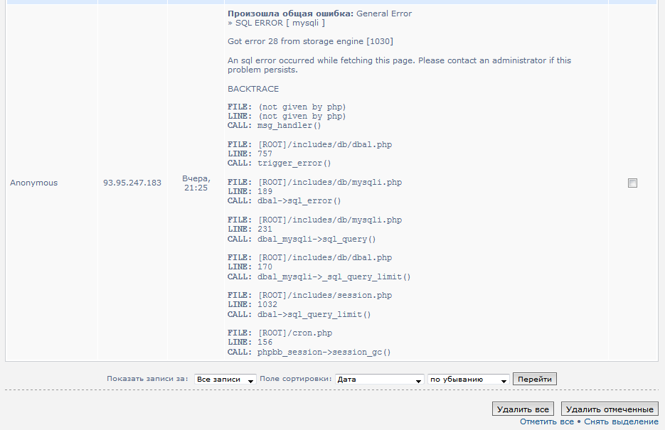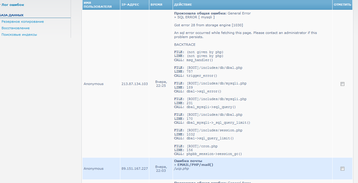 Форум был внезапно вырублен. Посмотрел логи и обнаружил: