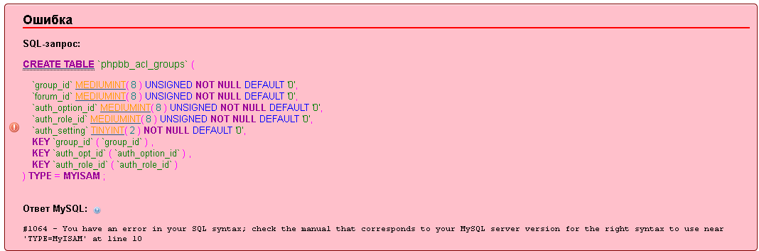 заменил все TYPE=MYISAM на ENGINE=MyISAM