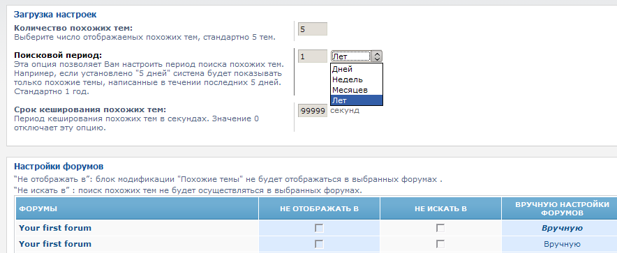 А в Precise Similar Topics II настроек больше. Можно настраивать каждый форум индивидуально, поисковый период и срок кеширования.