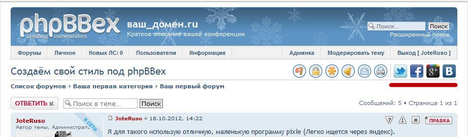VEG:Но! Если у вас есть некоторые познания в HTML и CSS (всему можно научиться на htmlbook.ru) — вы сможете самостоятельно портировать любой стиль с phpBB на phpBBex.