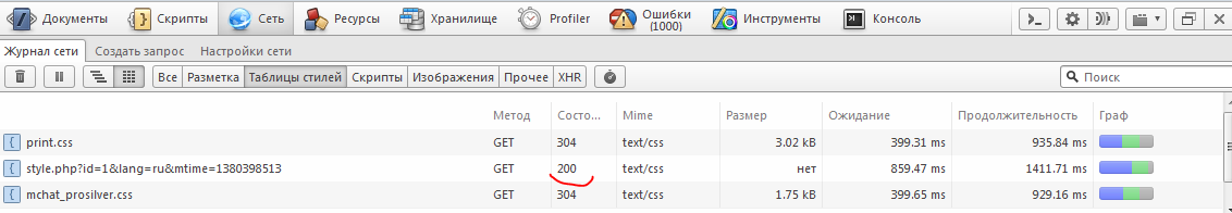 Sumanai, для скрипта style.php ошибок в логе сервера нет. В логе серврера при запросе к style.php всегда статус ответа = 200 и размер ответа = 24830