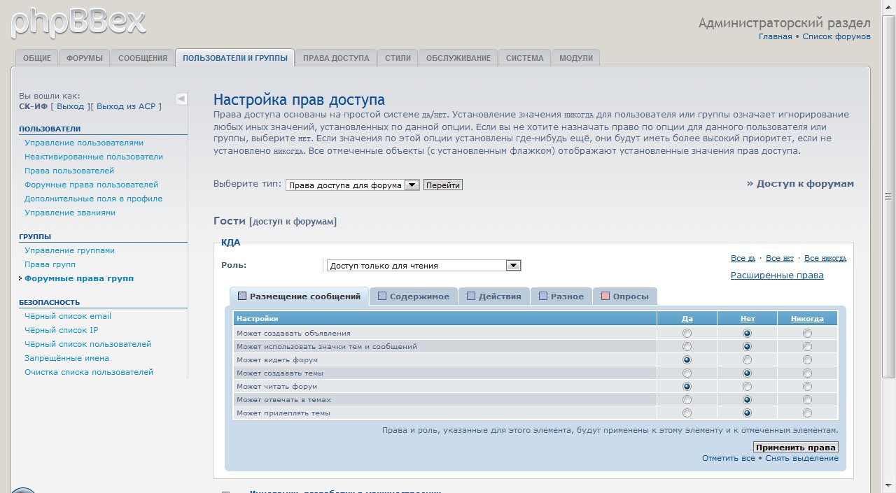 Я отключил возможность создавать новые темы для гостей и зарегистрированных пользователей. Как я понял, это регулируется предоставлением прав. Для зарегистрированных польз. так и есть. Но для гостей почему-то по-прежнему действует возможность создавать темы. Как их отлучить от этого? Где ещё какие права надо урезать?