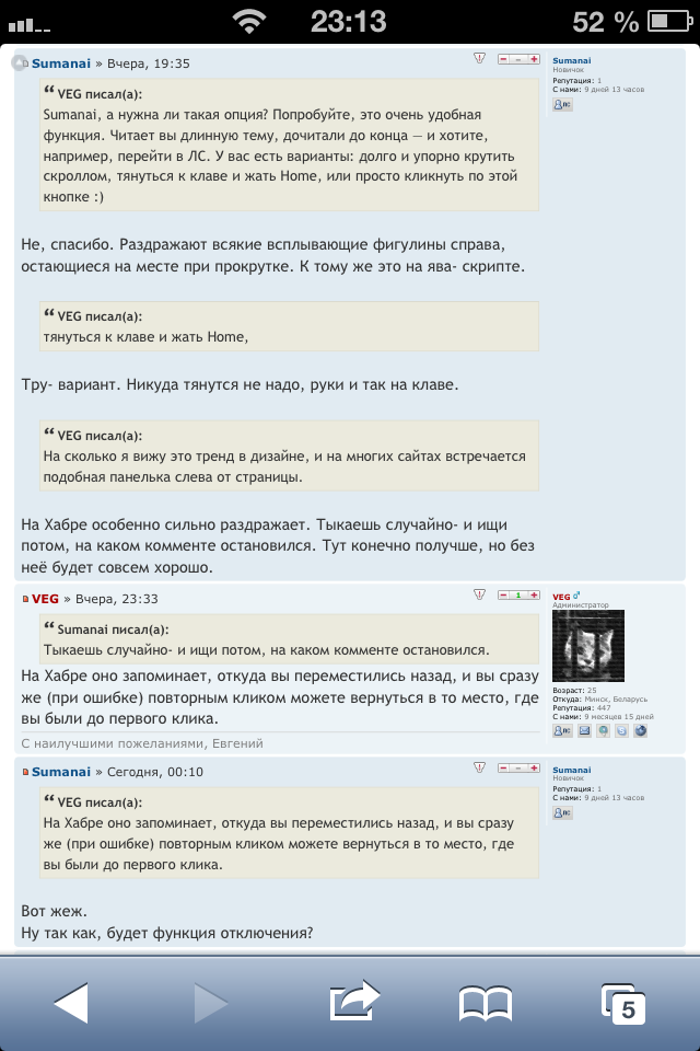На Хабре особенно сильно раздражает. Тыкаешь случайно- и ищи потом, на каком комменте остановился. Тут конечно получше, но без неё будет совсем хорошо.