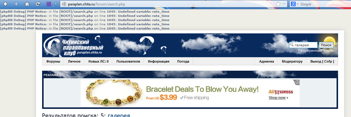 В шапке, в поле поиск набираю слово, после нажатия на поиск, на странице http://paraplan.chita.ru/forum/search.php с результатами, на вверху странице вылазит эта ошибкаVEG:Также опишите по шагам, как вы запускаете страницу поиска с ошибкой.