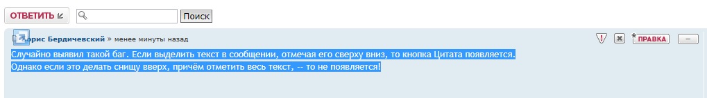 Случайно выявил такой баг. Если выделить текст в сообщении, отмечая его сверху вниз, то кнопка Цитата появляется.Однако если это делать снизу вверх, причём отметить весь текст, -- то не появляется!Добавлено спустя 2 минуты 10 секунд:Вот: