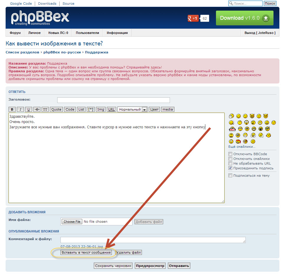 Подскажите, пожалуйста, каким образом можно отобразить вложенные изображения в тексте сообщения, а не после него?