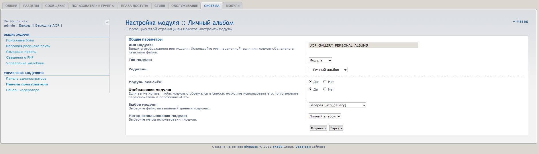 Невозможно добавить личные альбомы. Через админку можно сделать личный альбом, но фото загрузить не получается, т.к. пользователь не может зайти в альбом. В панеле пользователя вкладки "Личный альбом" вообще нет, хотя в админке включена.
